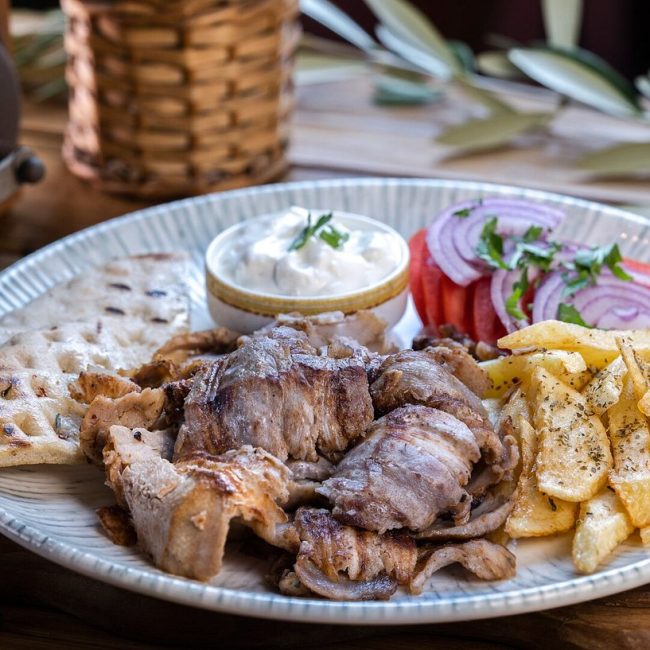 Πίτα, πατάτες τηγανητές, ντομάτα, κρεμμύδι, τζατζίκι